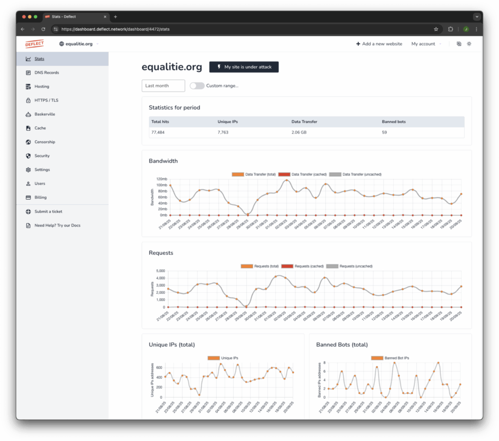 - Banned Bots (total): the IPs identified as malicious and banned by Deflect